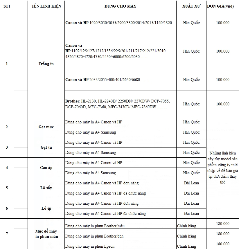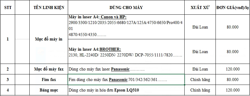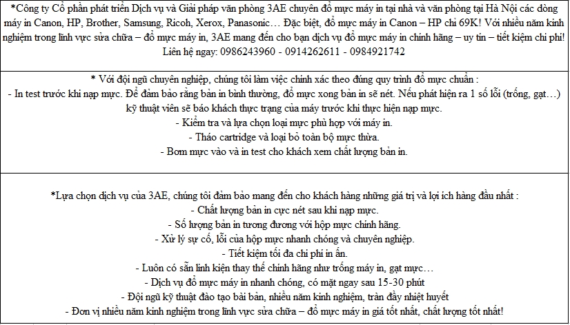 Với phương châm Dịch vụ là Hàng đầu, CÔNG TY CỔ PHẦN PHÁT TRIỂN DỊCH VỤ VÀ GIẢI PHÁP VĂN PHÒNG 3AE ưu tiên mang đến cho khách hàng những giá trị tốt nhất - những giải pháp tối ưu nhất và đặc biệt là những sản phẩm chính hãng có giá thành tốt nhất.Chúng tôi xin gửi đến quý khách bảng báo giá đổ mực cùng những lợi ích đi kèm theo đó
