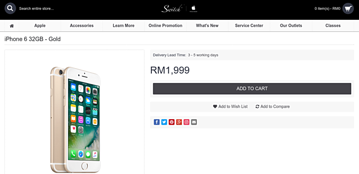 Nhà bán lẻ Malaysia – Switch mới đây đã lên kệ trực tuyến mẫu iPhone 6 32 GB với giá bán 450 USD (khoảng 10.2 triệu đồng). Để so sánh, tại thị trường Ấn Độ nó có giá là 460 USD trong khi tại Đài Loan, iPhone 6 32 GB được cung cấp “miễn phí” với một hợp đồng nhà mạng 30 tháng giá 45 USD/tháng.