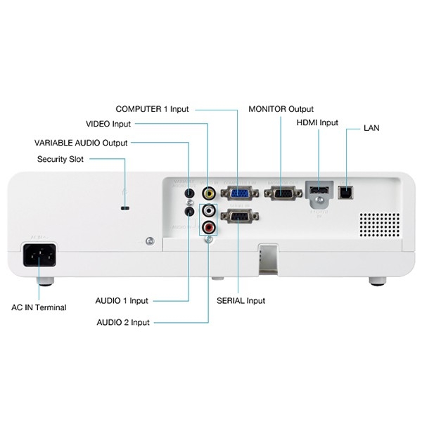 HDMI IN, 2 COMPUTER IN, MONITOR OUT, VIDEO IN, 2 AUDIO IN, AUDIO OUT, LAN, SERIAL IN, USB-Type A, USB- Type B. | HDMI IN, 2 COMPUTER IN, MONITOR OUT, VIDEO IN, 2 AUDIO IN, AUDIO OUT, LAN, SERIAL IN, USB-Type A, USB- Type B. |