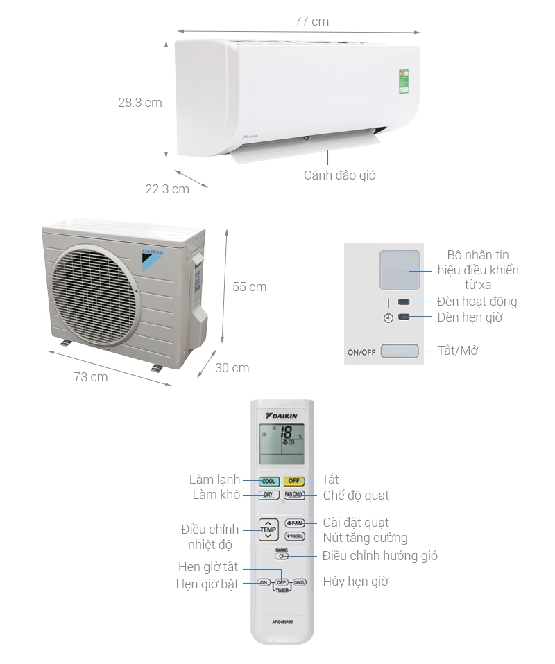 Thông tin cục nóng:Dài 73 cm - Cao 55 cm - Dày 30 cm - Nặng 32 kg