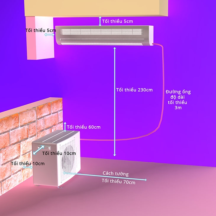 Mỗi hãng, mỗi dòng máy có độ dài lắp đặt ống đồng khác nhau (thông thường chiều dài tối thiểukhoảng 3m, tối đa khoảng 15m hoặc 20m cho những loại có công suất lớn) và thông thường độ dài trung bình để máy hoạt động tốt nhất khoảng từ 3 - 7m. Thông tin cụ thể bạn khoảng cách cho từng máy, bạn có thể xem trong phần thông số kỹ thuật ở mỗi sản phẩm.