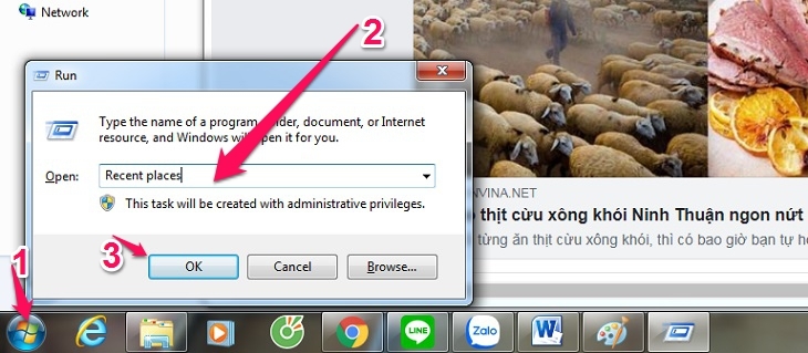 Bước 1: Tương tự như trên, bạn cũng vào Start-> gõ Run trong tìm kiếm-> nhập Recent places -> Ok.