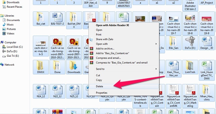 Bước 2: Click chuột chọn tất cả file, nhấp chuột phải Delete là xong