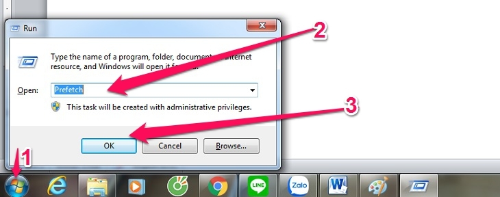 Bước 1: Mở Start -> gõ Run trong tìm kiếm -> gõ Prefetch, rồi bấm Ok.