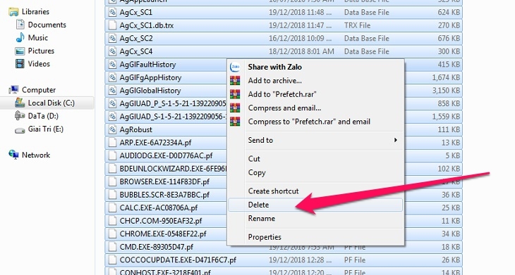 Bước 2: Thư mục Prefetch được mở ra, chọn tất cả (Ctrl + A), click chuột phải chọn Delete là xong.
